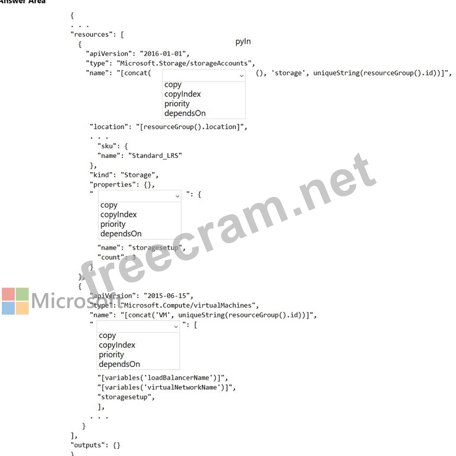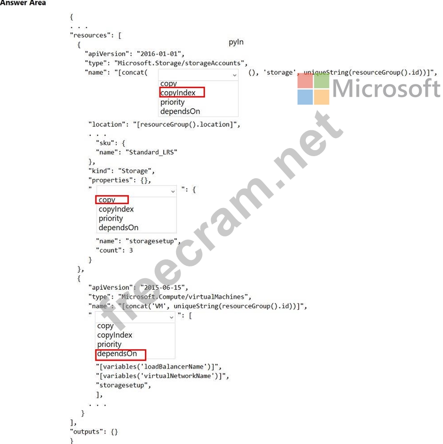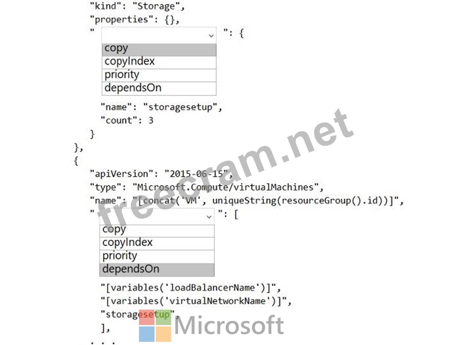 How should you complete the Azure Resource Manager template? To answer, select the appropriate options in the answer area.
