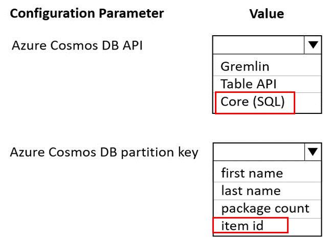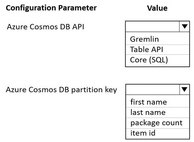 You are developing an application to collect the following telemetry data for delivery drivers: first name, last name, package count, item id, and current location coordinates. The app will store the data in Azure Cosmos DB.