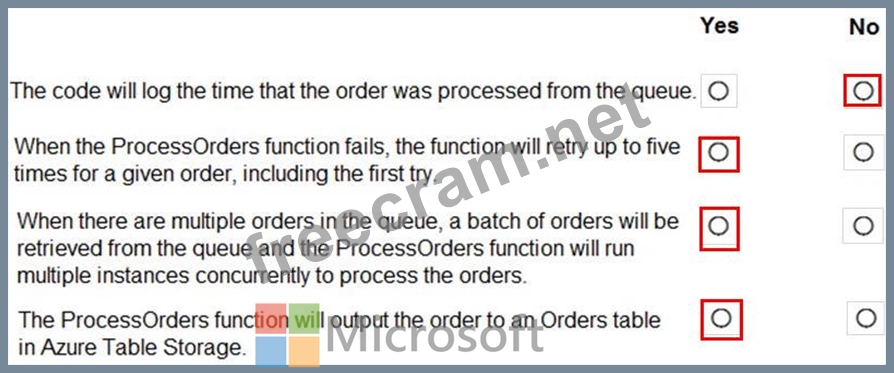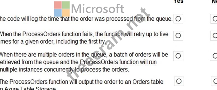You are developing an Azure Function App by using Visual Studio. The app will process orders input by an Azure Web App. The web app places the order information into Azure Queue Storage.