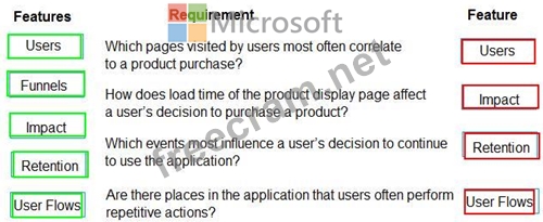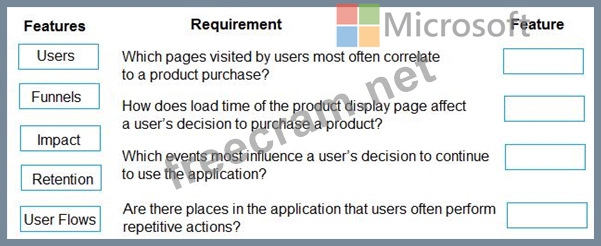 Which Azure Application Insights Usage Analysis features should you use? To answer, drag the appropriate features to the correct requirements. Each feature may be used once, more than once, or not at all. You may need to drag the split bar between panes or scroll to view content.