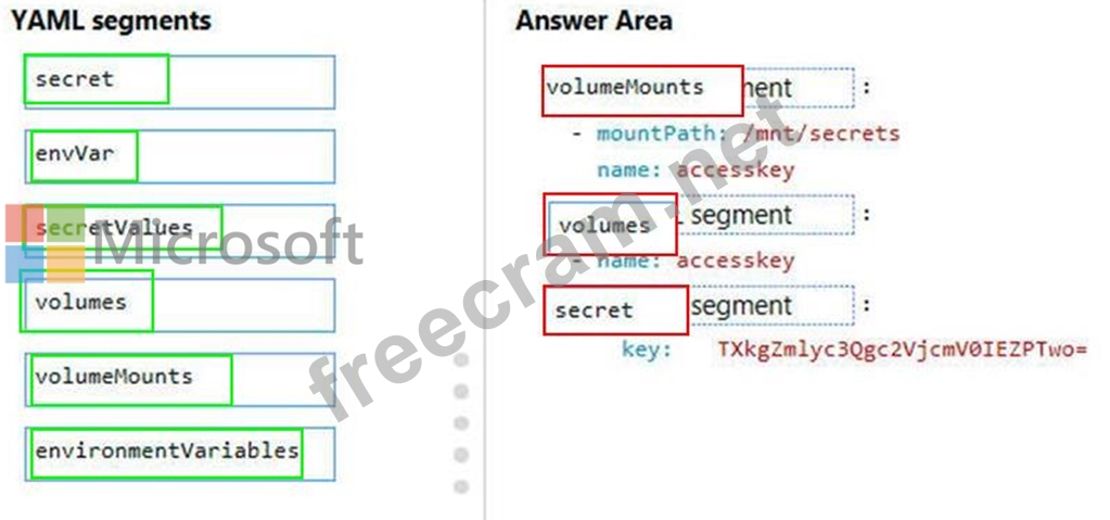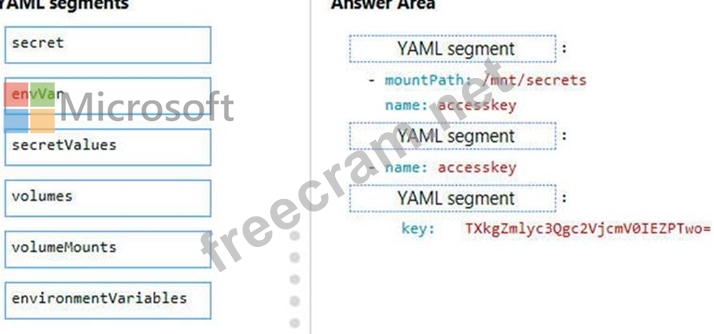 How should you complete the YAML markup? To answer, drag the appropriate YAML segments to the correct locations. Each YAML segment may be used once, more than once, or not at all. You may need to drag the split bar between panes or scroll to view content.
