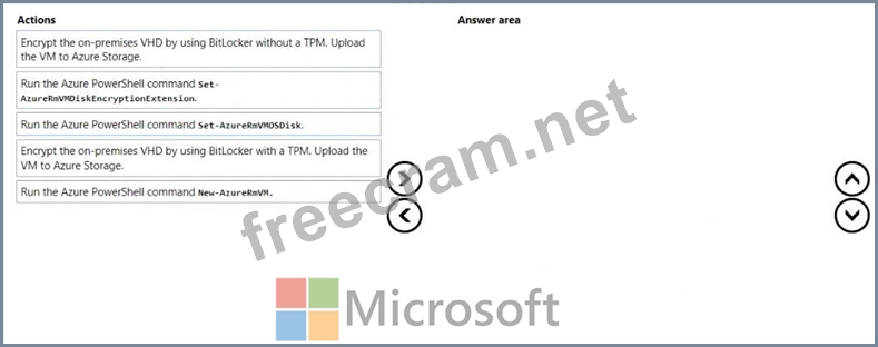 Step 1: Encrypt the on-premises VHD by using BitLocker without a TPM. Upload the VM to Azure Storage Step 2: Run the Azure PowerShell command Set-AzureRMVMOSDisk To use an existing disk instead of creating a new disk you can use the Set-AzureRMVMOSDisk command.