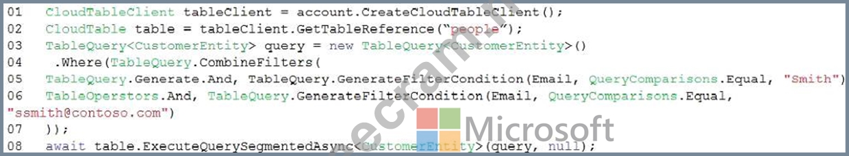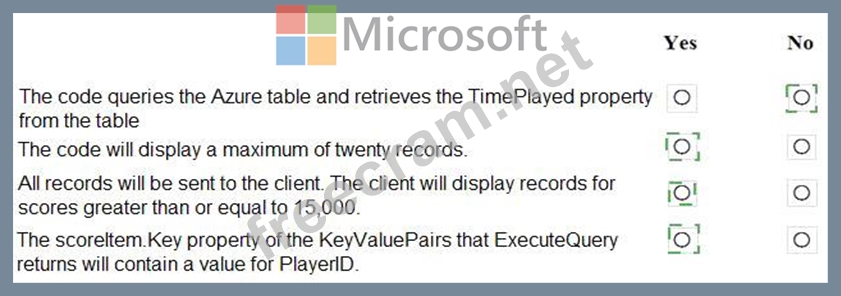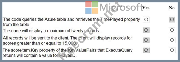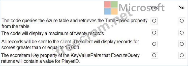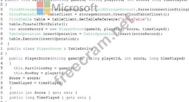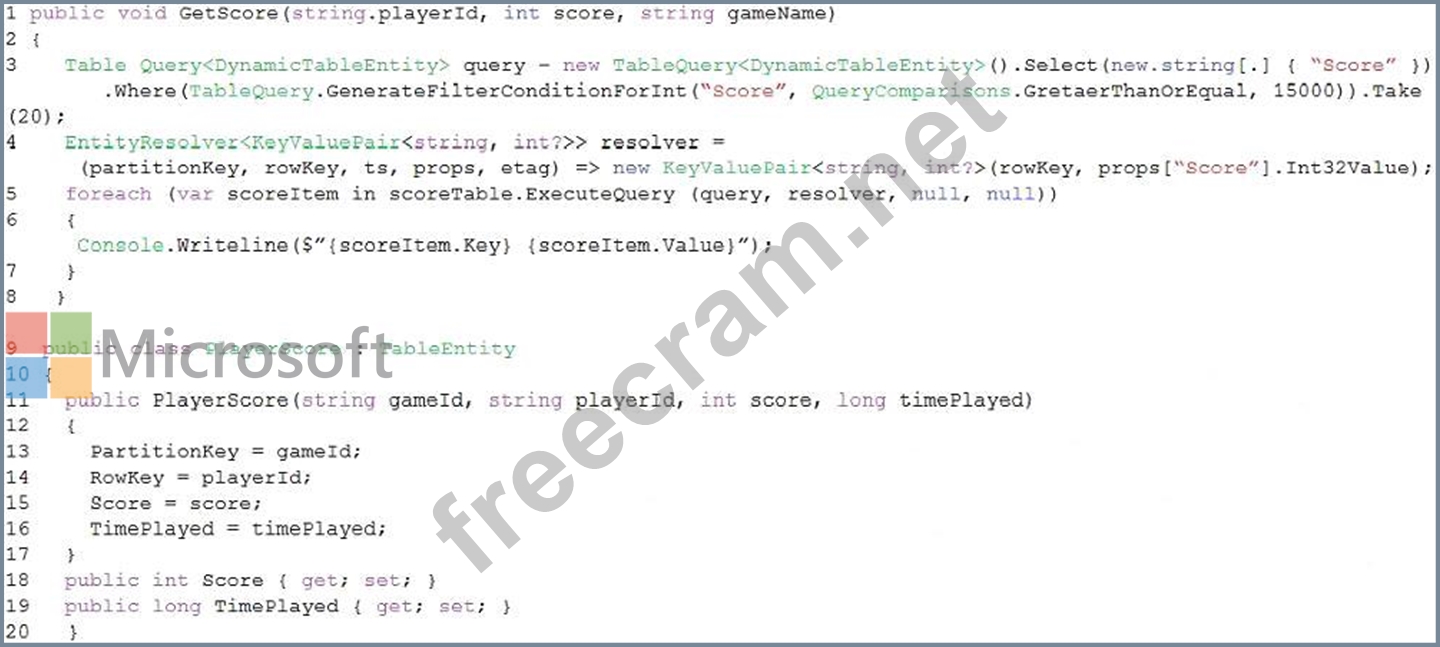 You have an app that stores player scores for an online game. The app stores data in Azure tables using a class named PlayerScore as the table entity. The table is populated with 100,000 records.