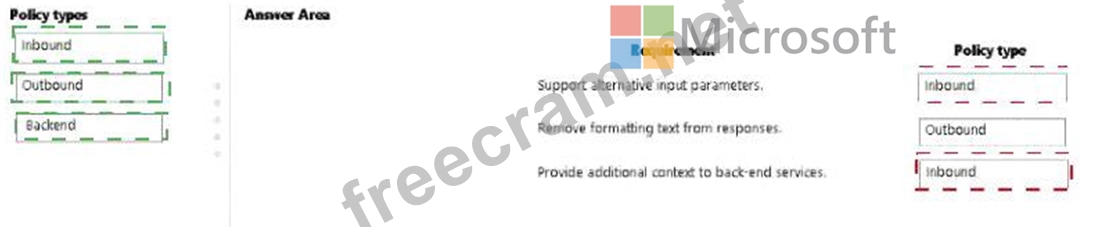 Which types of policies should you implement? To answer, drag the policy types to the correct scenarios.