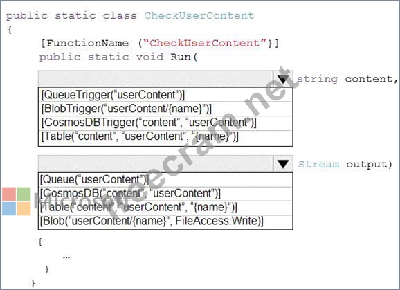 Scenario: You must create an Azure Function named CheckUserContent to perform the content checks.