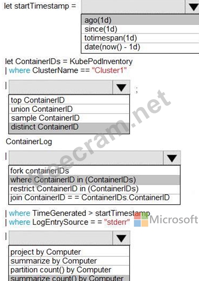 How should you complete the Azure Monitor query? To answer, select the appropriate options in the answer area.