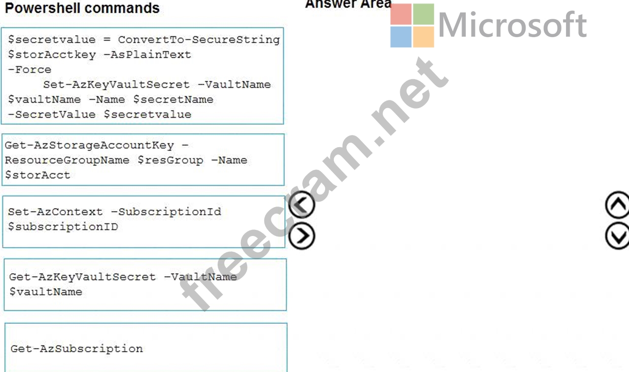 Step 4: $secretvalue = ConvertTo-SecureString <storageAccountKey> -AsPlainText -Force Set-AzKeyVaultSecret -VaultName <vaultName> -Name <secretName> -SecretValue $secretvalue After retrieving your secret (in this case, your storage account key), you must convert that key to a secure string, and then create a secret with that value in your key vault.