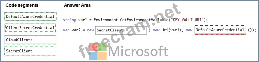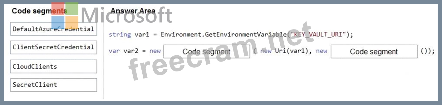 How should you complete the code segment? To answer, drag the appropriate code segments to the correct locations. Each code segment may be used once, more than once, or not at all. You may need to drag the split bar between panes or scroll to view content.