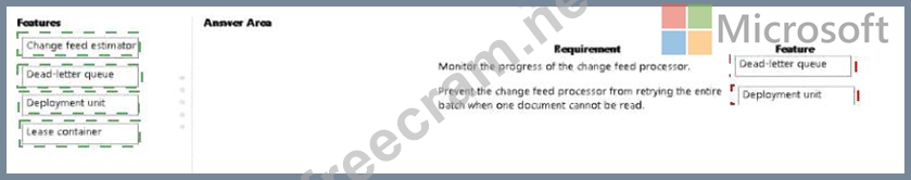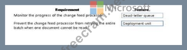 You attempt to lead a batch of 100 documents. The process falls when reading one of the documents. The solution must monitor the progress of the change feed processor instance on the new container as the change feed is read. You must prevent the change feed processor from retrying the entire batch when one document cannot be read.