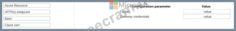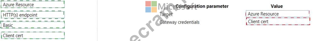 Which target and gateway credential type should you use? To answer, drag the appropriate values to the correct parameters. Each value may be used once, more than once, or not at all. You may need to drag the split bar between panes or scroll to view content.