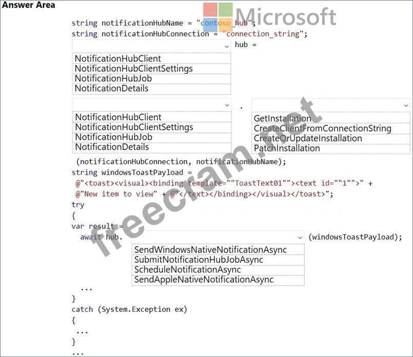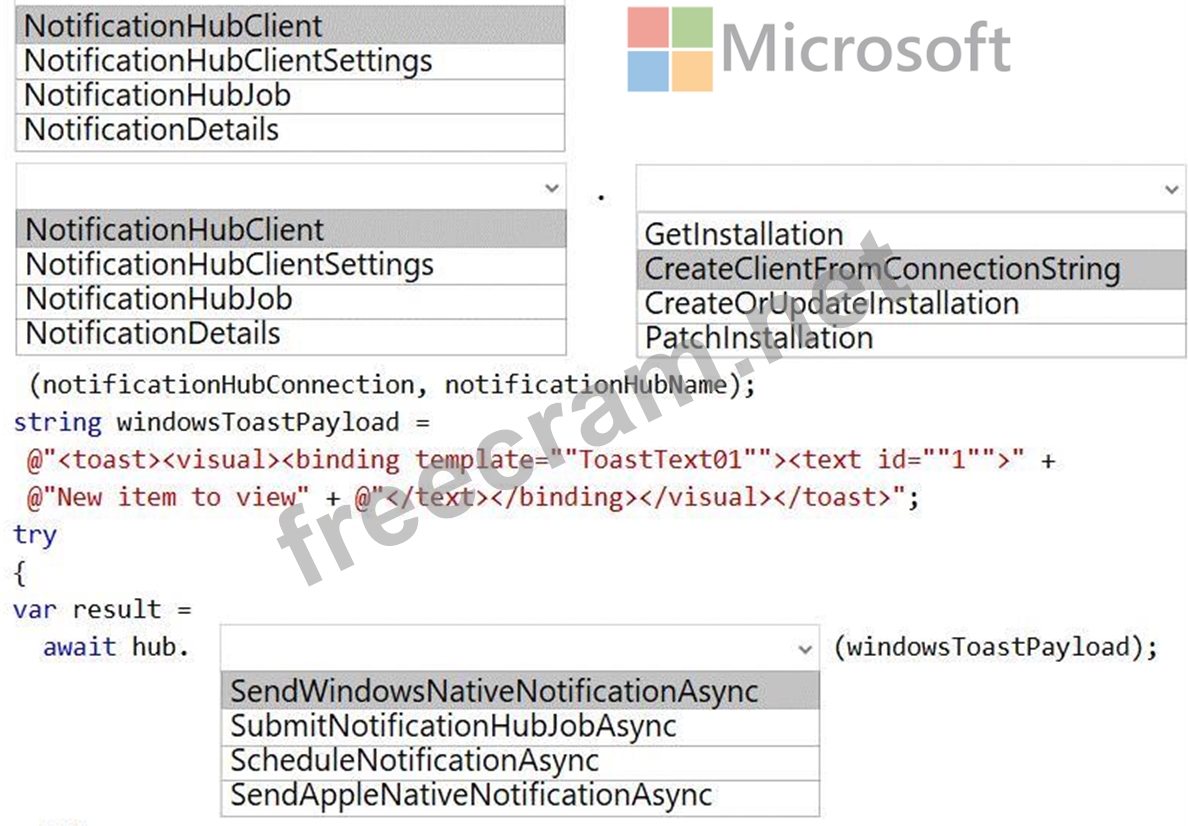 How should you complete the code segment? To answer, select the appropriate options in the answer area.