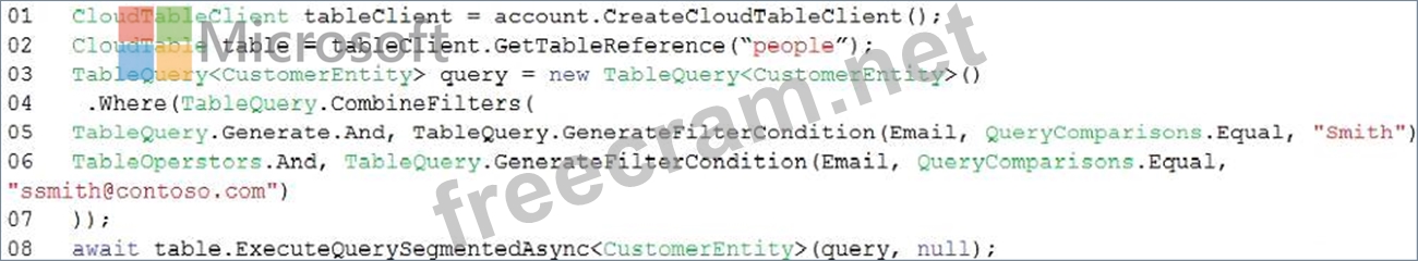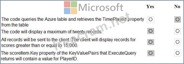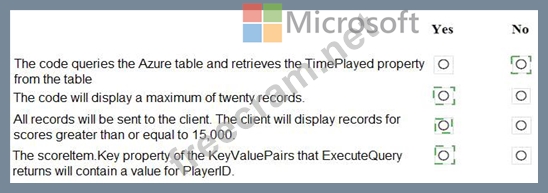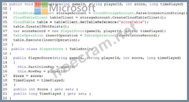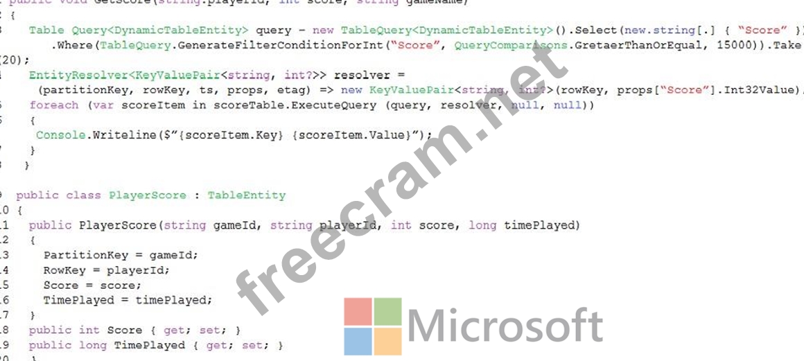 You have an app that stores player scores for an online game. The app stores data in Azure tables using a class named PlayerScore as the table entity. The table is populated with 100,000 records.