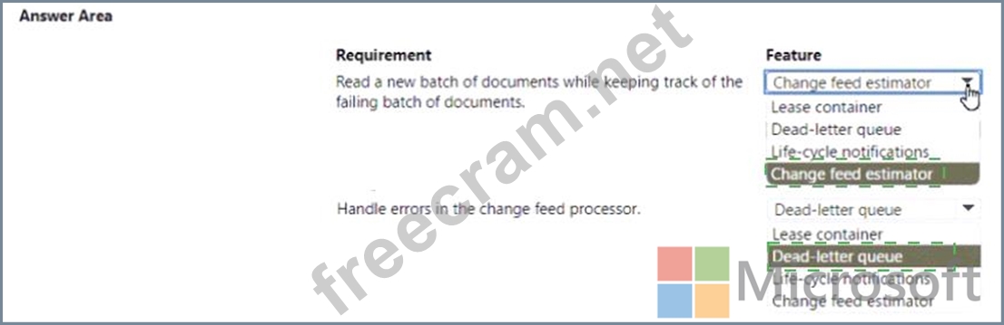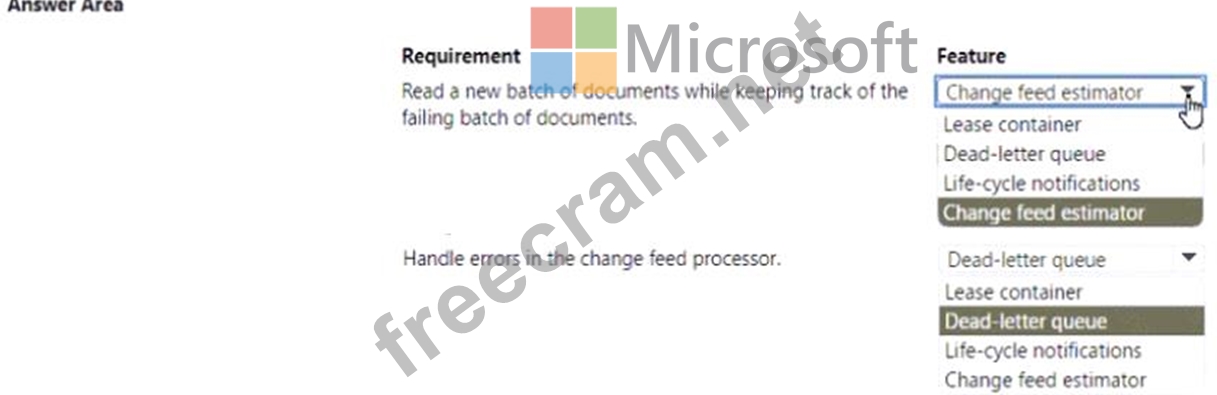 You implement an Azure solution to include Azure Cosmos DB. the latest Azure Cosmos DB SDK, and the Azure Cosmos DB for NoSQL API. You also implement a change feed processor on a new container instance by using the Azure Functions trigger for Azure Cosmos DB.