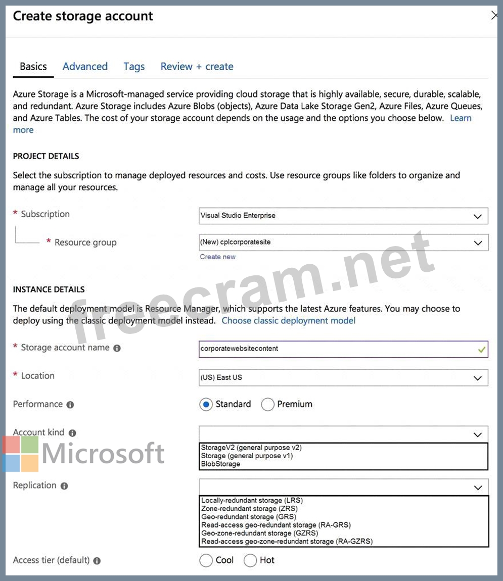 You need to configure the Account Kind, Replication, and Storage tier options for the corporate website's Azure Storage account.