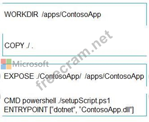 You plan to create a Docker image that runs as ASP.NET Core application named ContosoApp. You have a setup script named setupScript.ps1 and a series of application files including ContosoApp.dll.
