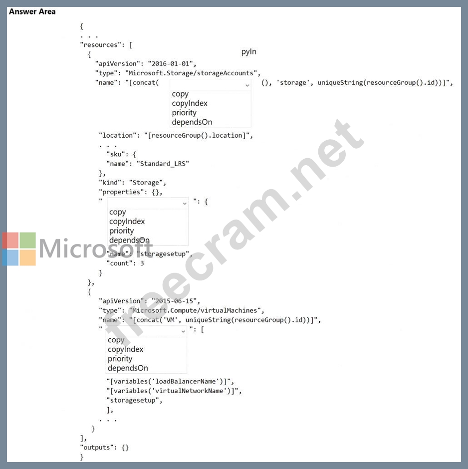 Notice that the name of each resource includes the copyIndex() function, which returns the current iteration in the loop. copyIndex() is zero-based.