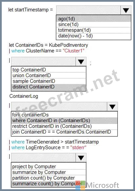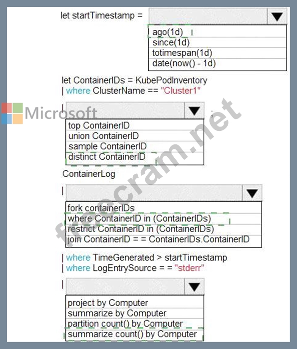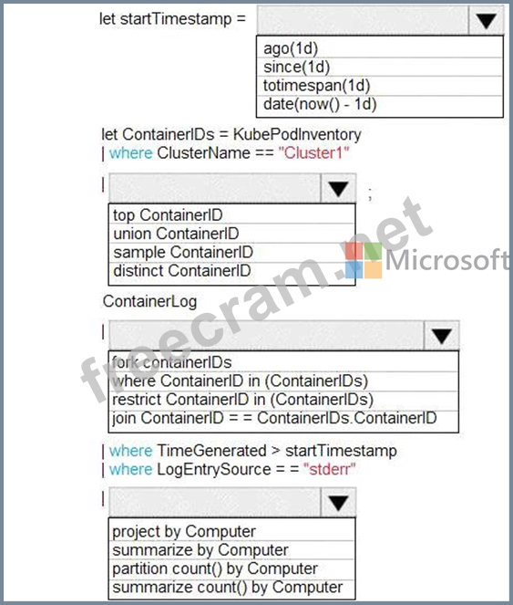 How should you complete the Azure Monitor query? To answer, select the appropriate options in the answer area.
