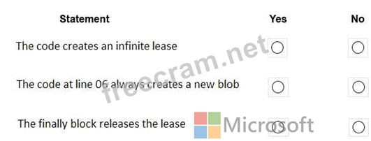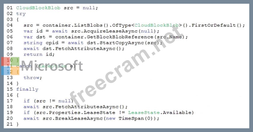 You are developing a solution that uses the Azure Storage Client library for .NET. You have the following code: (Line numbers are included for reference only.)