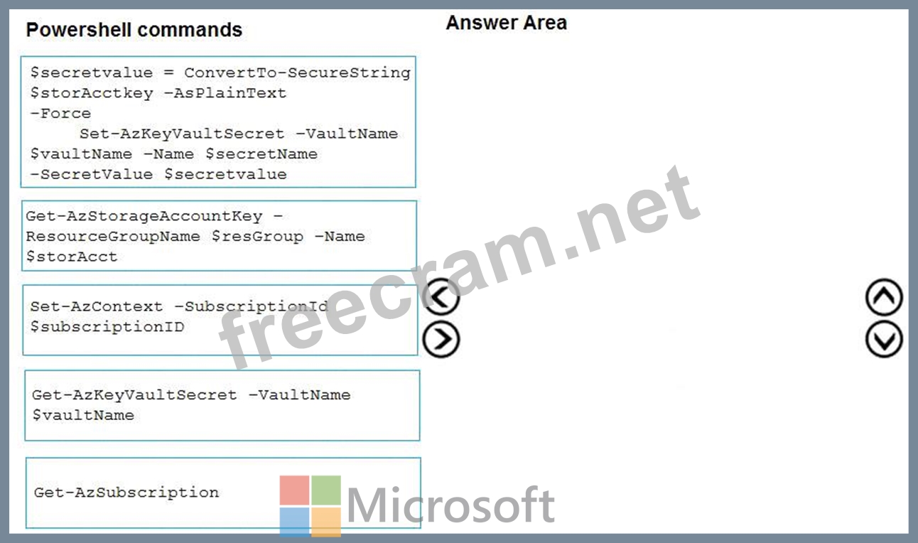 Step 4: $secretvalue = ConvertTo-SecureString <storageAccountKey> -AsPlainText -Force Set-AzKeyVaultSecret -VaultName <vaultName> -Name <secretName> -SecretValue $secretvalue After retrieving your secret (in this case, your storage account key), you must convert that key to a secure string, and then create a secret with that value in your key vault.