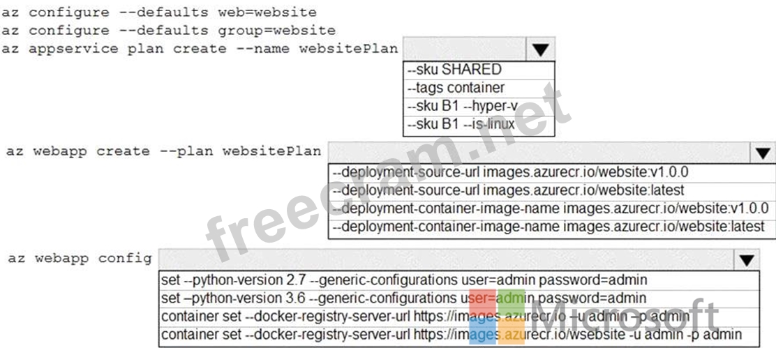 Box 3: az webapp config container set -url https://images.azurecr.io -u admin -p admin az webapp config container set Set a web app container's settings.