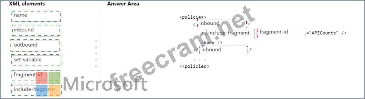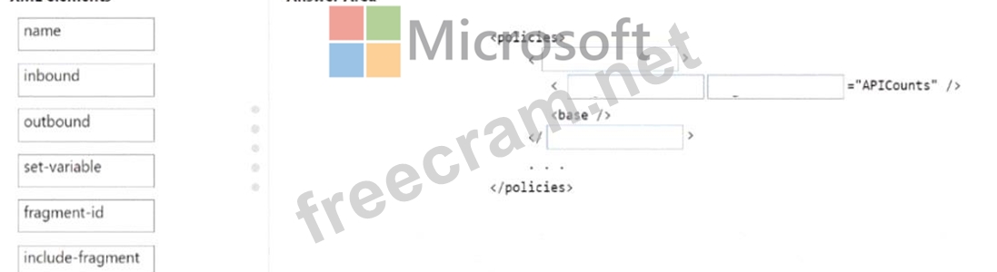 How should you complete the policy segment? To answer, drag the appropriate XML elements to the correct targets. Each XML element may be used once, more than once, or not at all. You may need to drag the split bar between panes or scroll to view content.