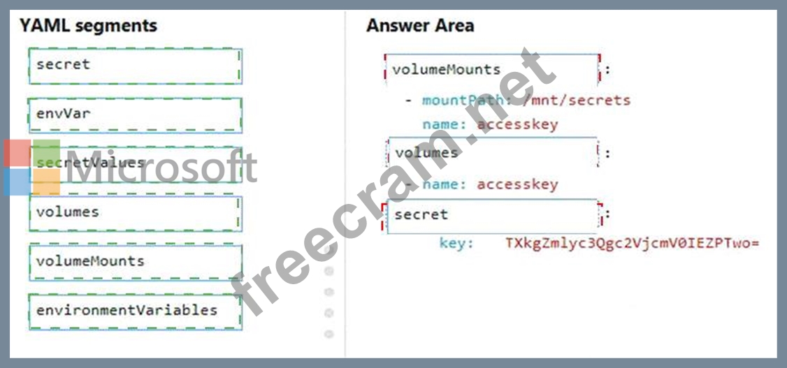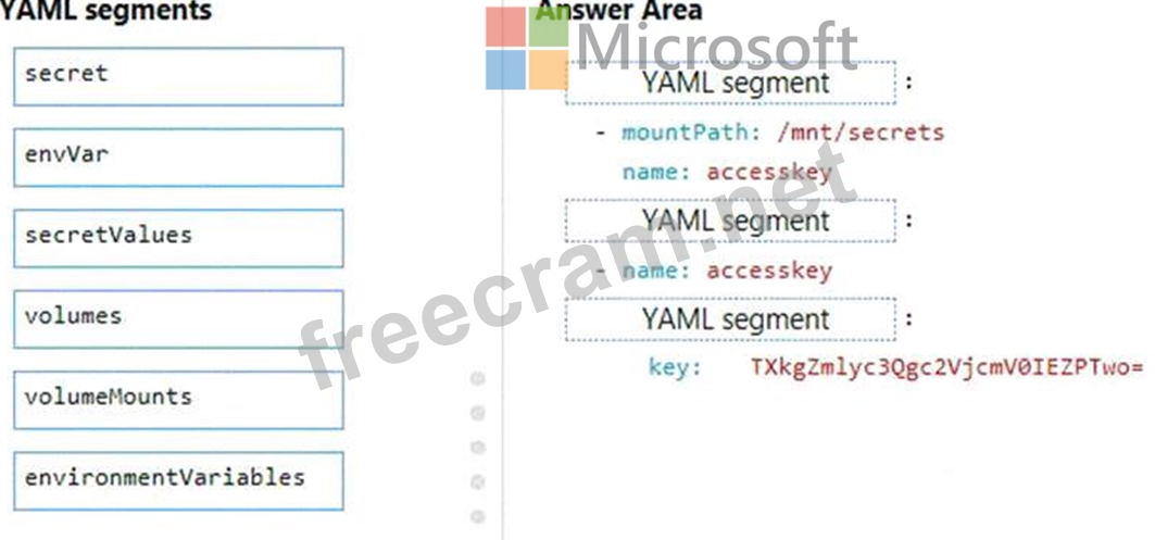 How should you complete the YAML markup? To answer, drag the appropriate YAML segments to the correct locations. Each YAML segment may be used once, more than once, or not at all. You may need to drag the split bar between panes or scroll to view content.