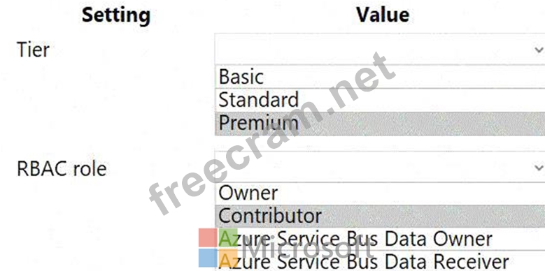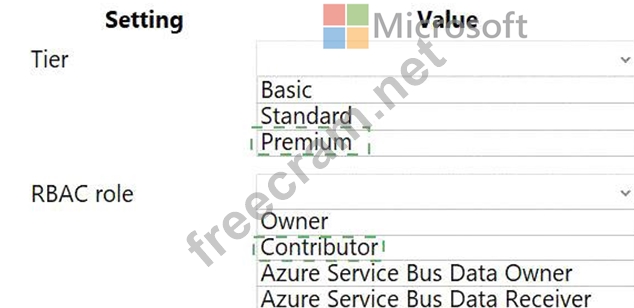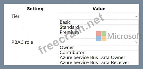 Which Azure Service Bus settings should you use? To answer, select the appropriate options in the answer area.