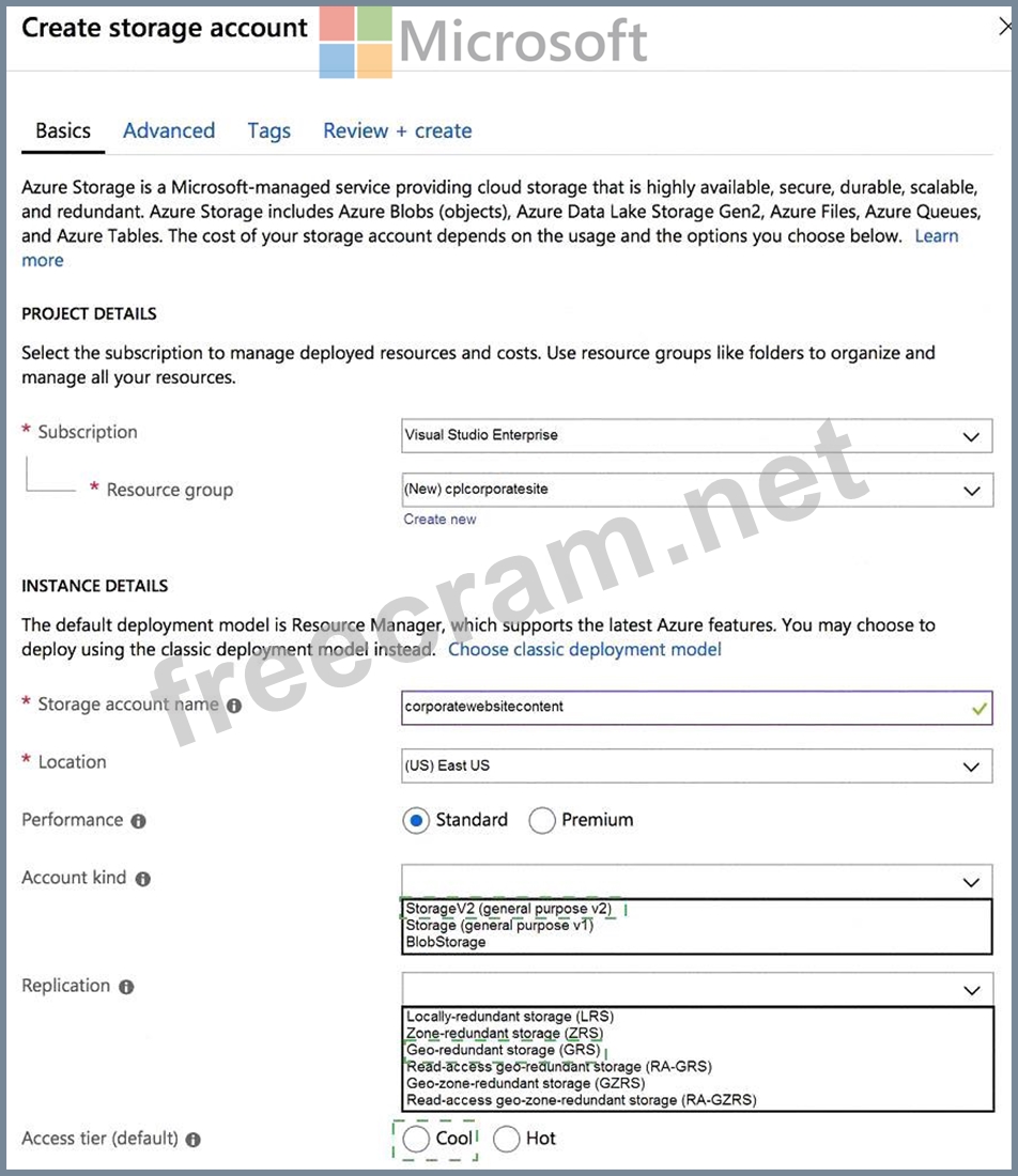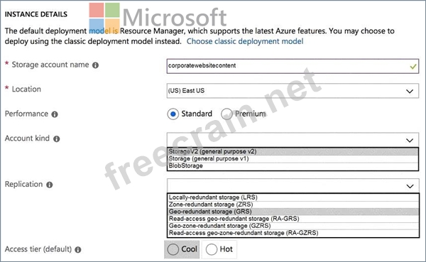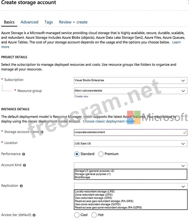 You need to configure the Account Kind, Replication, and Storage tier options for the corporate website's Azure Storage account.