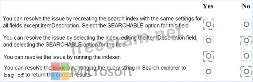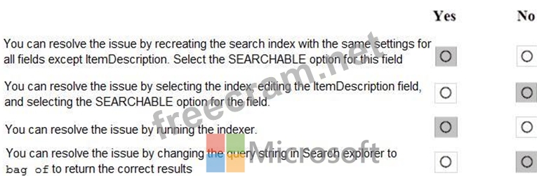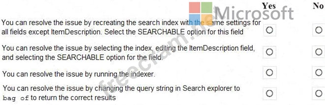When users search for items by description, Search explorer returns no records. The Search Explorer exhibit shows the query and results for a test. In the test, a user is trying to search for all items in the table that have a description that contains the word bag. (Click the Search Explorer tab.) You need to resolve the issue.