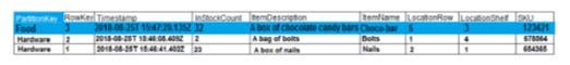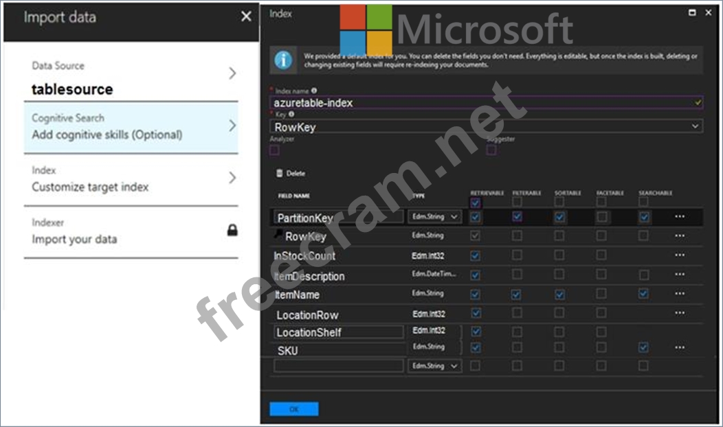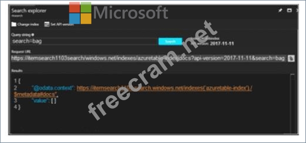 You use an Azure table as the data source for the import operation. The table contains three records with item inventory data that matches the fields in the Storage data exhibit. These records were imported when the index was created. (Click the Storage Data tab.) When users search with no filter, all three records are displayed.