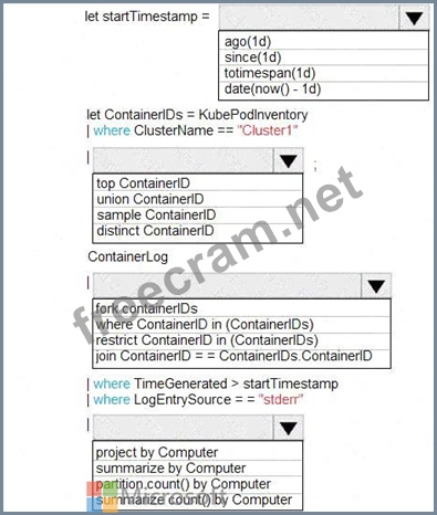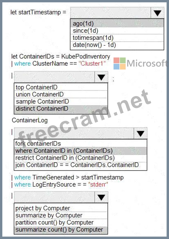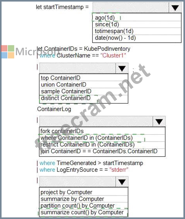How should you complete the Azure Monitor query? To answer, select the appropriate options in the answer area.