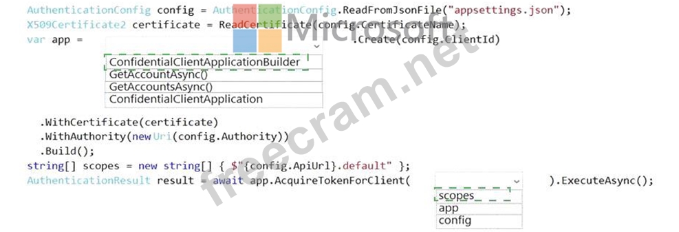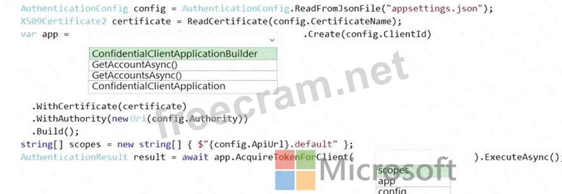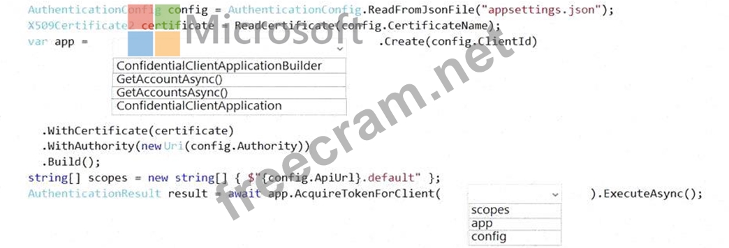 You create an appsettings.json file containing the certificate name, client identifier for the application, and the tenant identifier of the Azure active Directory (Azure AD). You create a method named ReadCertificate to return the X509 certificate by name.