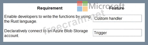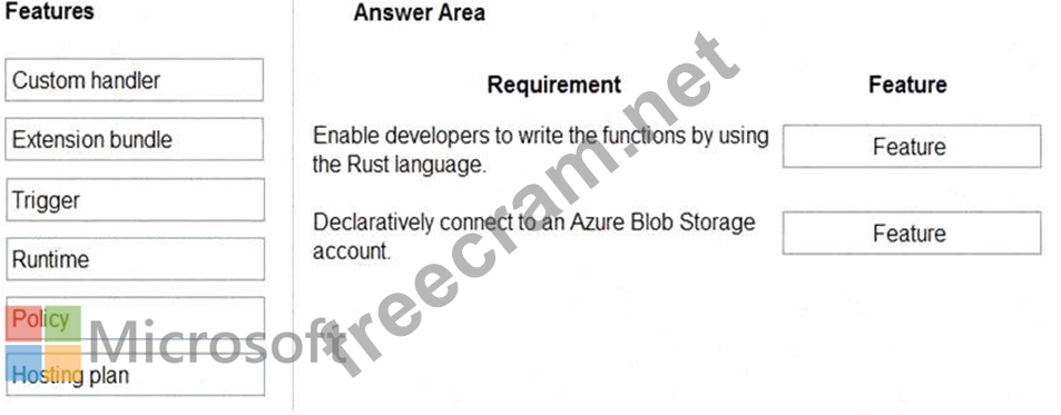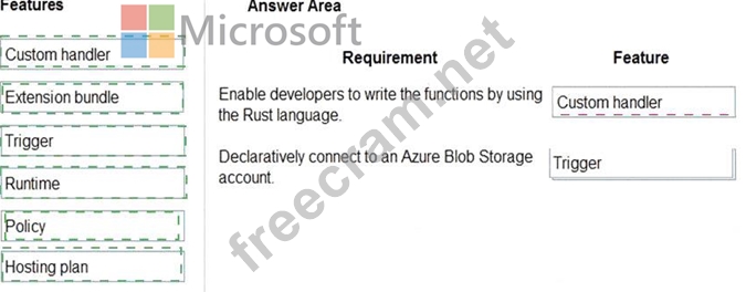 Which Azure Function app features should you use? To answer, drag the appropriate features to the correct requirements. Each feature may be used once, more than once, or not at all. You may need to drag the split bar between panes or scroll to view content.