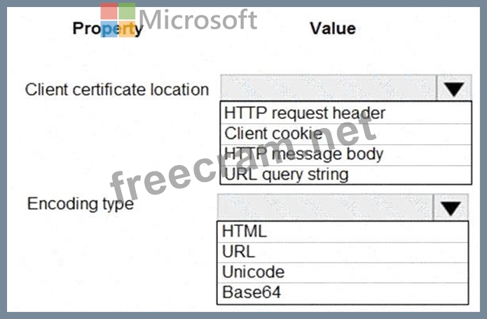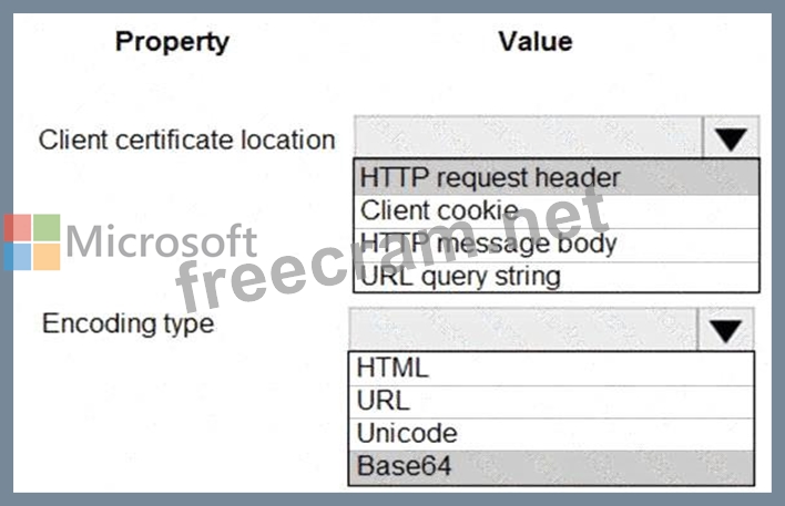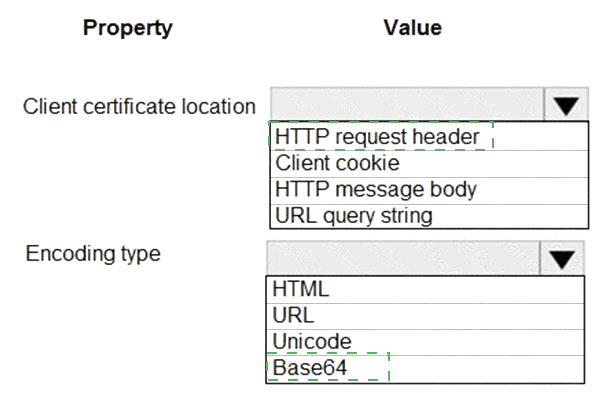 You need to validate the client certificate in the web app. To answer, select the appropriate options in the answer area.