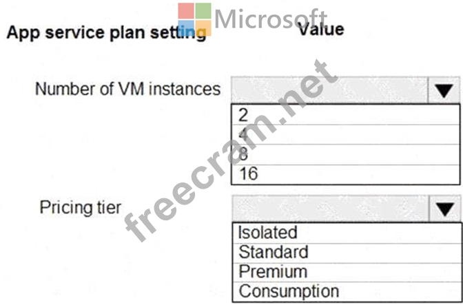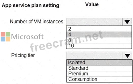 How should you configure the App Service plan? To answer, select the appropriate settings in the answer area.