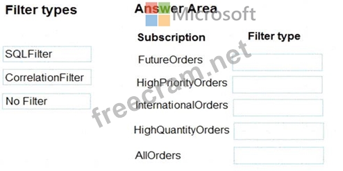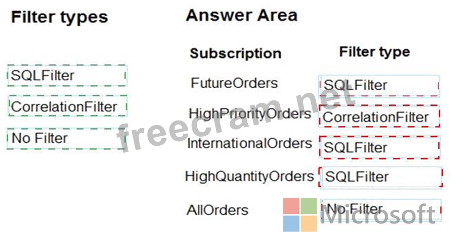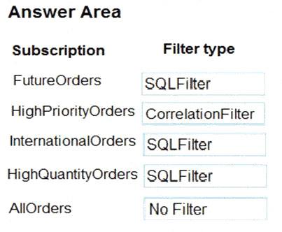 Correlation Filters - A CorrelationFilter holds a set of conditions that are matched against one or more of an arriving message's user and system properties. A common use is to match against the CorrelationId property, but the application can also choose to match against ContentType, Label, MessageId, ReplyTo, ReplyToSessionId, SessionId, To, and any user-defined properties. A match exists when an arriving message's value for a property is equal to the value specified in the correlation filter. For string expressions, the comparison is case-sensitive. When specifying multiple match properties, the filter combines them as a logical AND condition, meaning for the filter to match, all conditions must match.