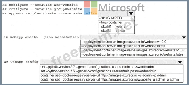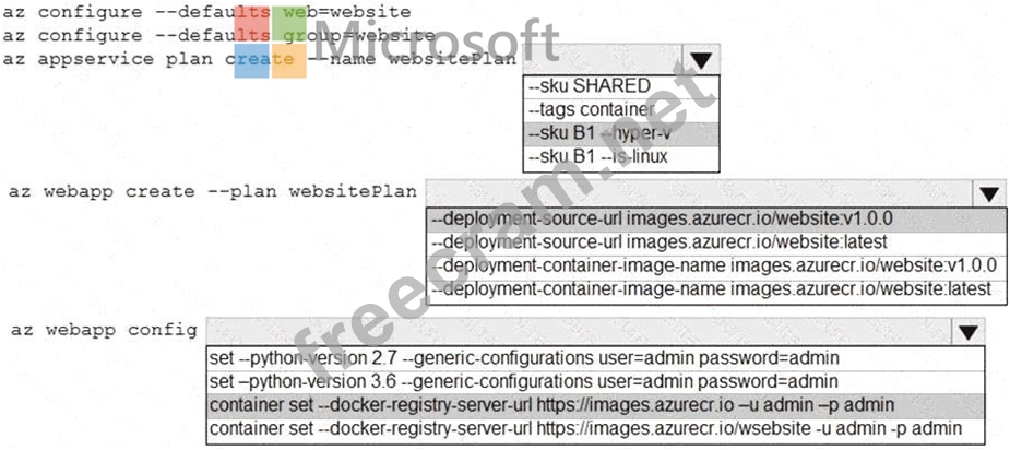 Box 3: az webapp config container set -url https://images.azurecr.io -u admin -p admin az webapp config container set Set a web app container's settings.