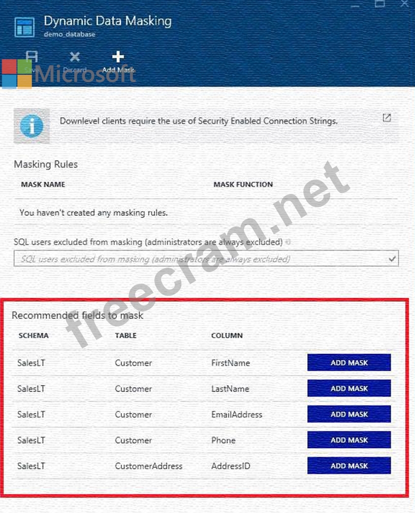 Which three items must you identify when configuring dynamic data masking? Each correct answer presents a part of the solution.