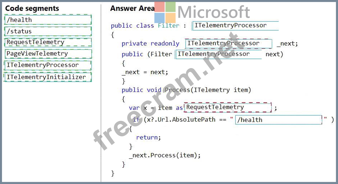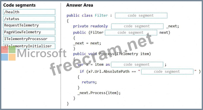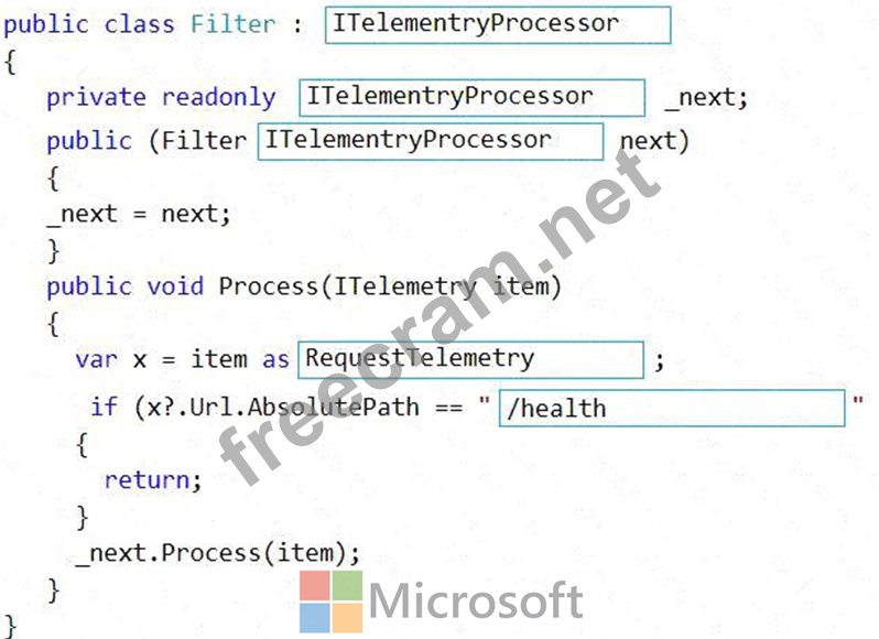 How should you complete the Filter class? To answer, drag the appropriate code segments to the correct locations. Each code segment may be used once, more than once, or not at all. You may need to drag the split bar between panes or scroll to view content.