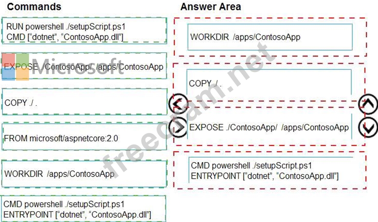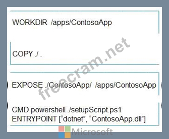 You plan to create a Docker image that runs as ASP.NET Core application named ContosoApp. You have a setup script named setupScript.ps1 and a series of application files including ContosoApp.dll.
