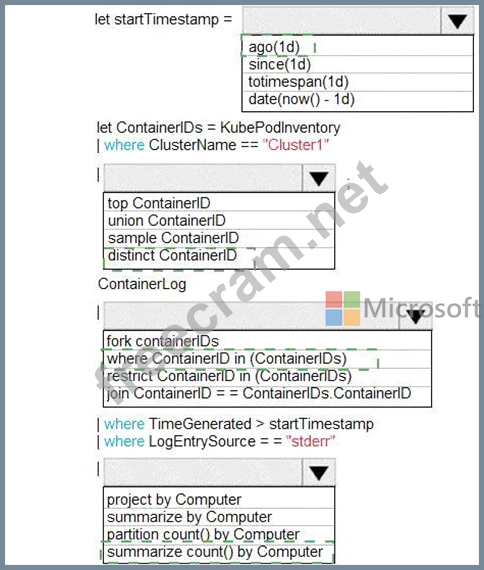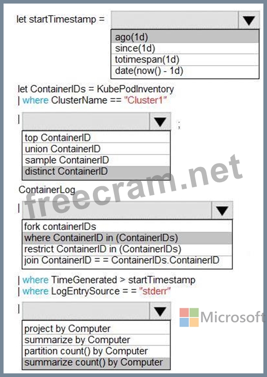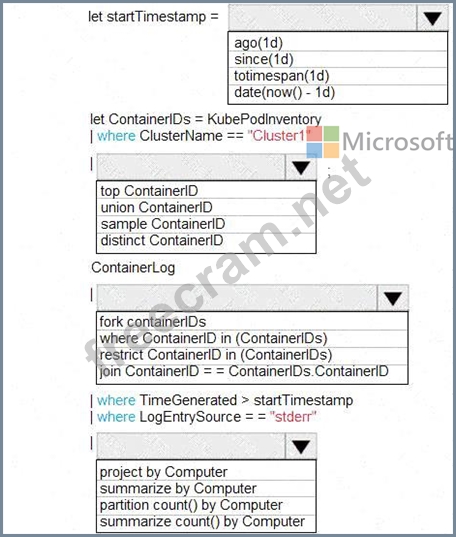 How should you complete the Azure Monitor query? To answer, select the appropriate options in the answer area.