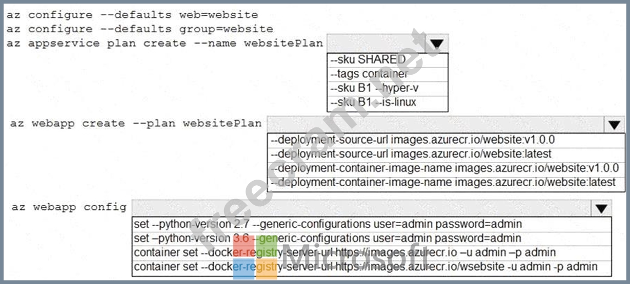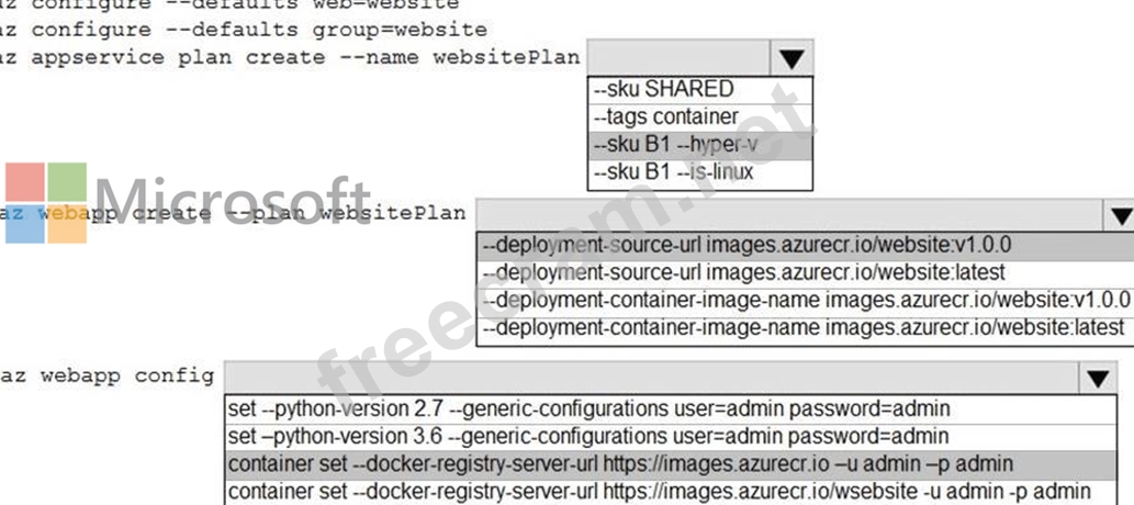 Box 3: az webapp config container set -url https://images.azurecr.io -u admin -p admin az webapp config container set Set a web app container's settings.