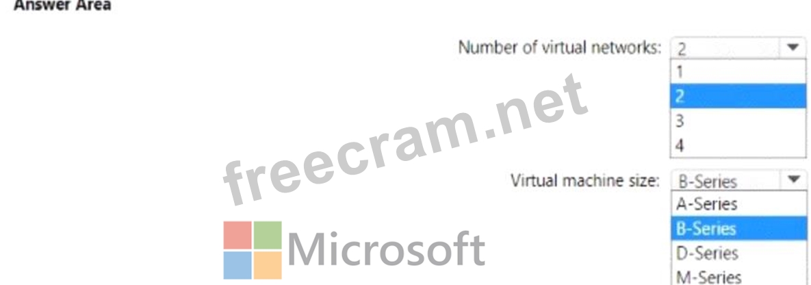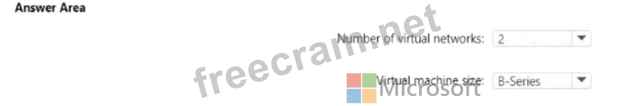 What is the minimum number of virtual networks you should deploy, and which virtual machine size should you use? To answer, select the appropriate options in the answer area.