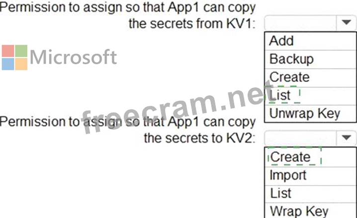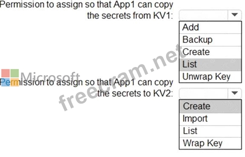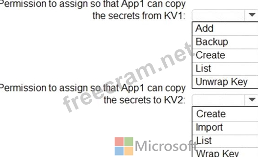You need to configure permissions so that App1 can copy all the secrets from KV1 to KV2. App1 currently has the Get permission for the secrets in KV1.