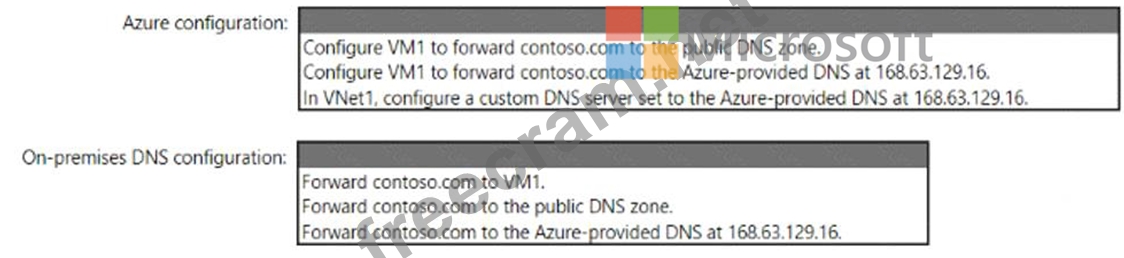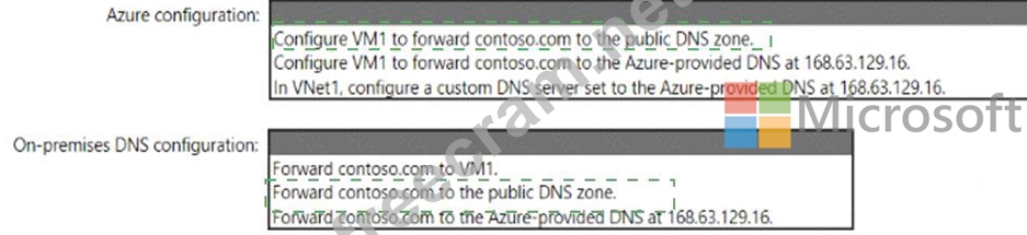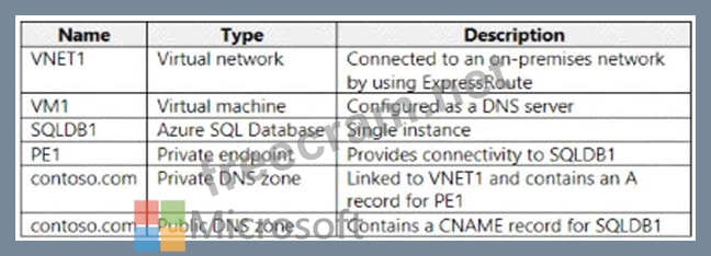 You need to design a solution that provides on-premises network connectivity to SQLDB1 through PE1. How should you configure name resolution? To answer, select the appropriate options in the answer area.