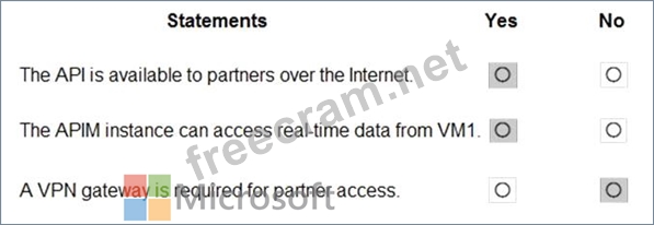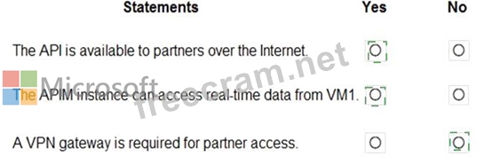 The chief technology officer (CTO) sends you the following email message: "Our developers have deployed the web service to a virtual machine named VM1. Testing has shown that the API is accessible from VM1 and VM2. Our partners must be able to connect to the API over the Internet. Partners will use this data in applications that they develop." You deploy an Azure API Management (APIM) service. The relevant API Management configuration is shown in the API exhibit. (Click the API tab.)