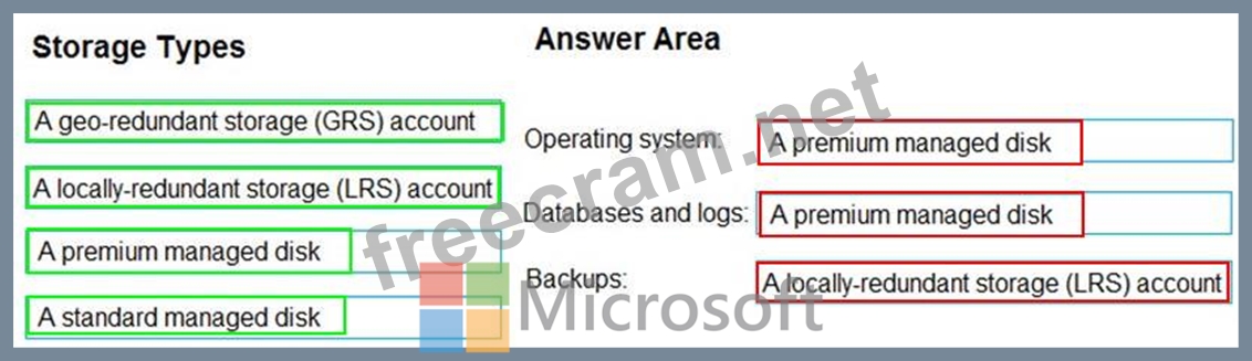 Which storage type should you recommend for each data type? To answer, drag the appropriate storage types to the correct data types. Each storage type may be used once, more than once, or not at all. You may need to drag the split bar between panes or scroll to view content.