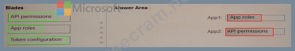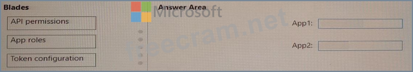 Which blade should you use to modify each app registration? To answer, drag the appropriate blades to the correct app registrations. Each blade may be used once, more than once, or not at all. You may need to drag the split bar between panes or scroll to view content.