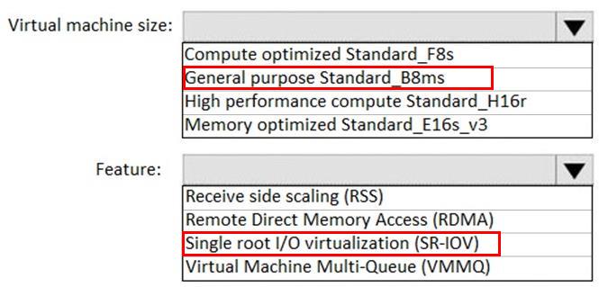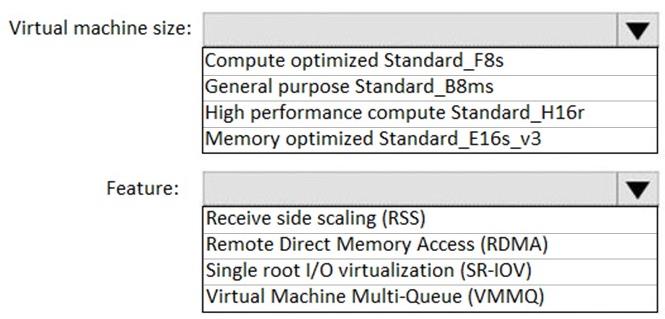 Which virtual machine size and feature should you use? To answer, select the appropriate options in the answer area.