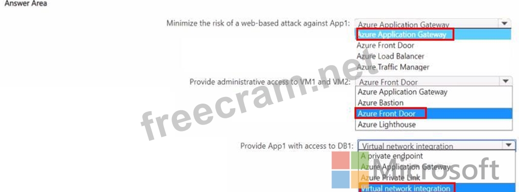 You plan to deploy an Azure App Service web app named App1 that will service users in a single geographical region. App1 will access a highly available database named DB1 that will be hosted on two Azure virtual machines named VM1 and VM2.